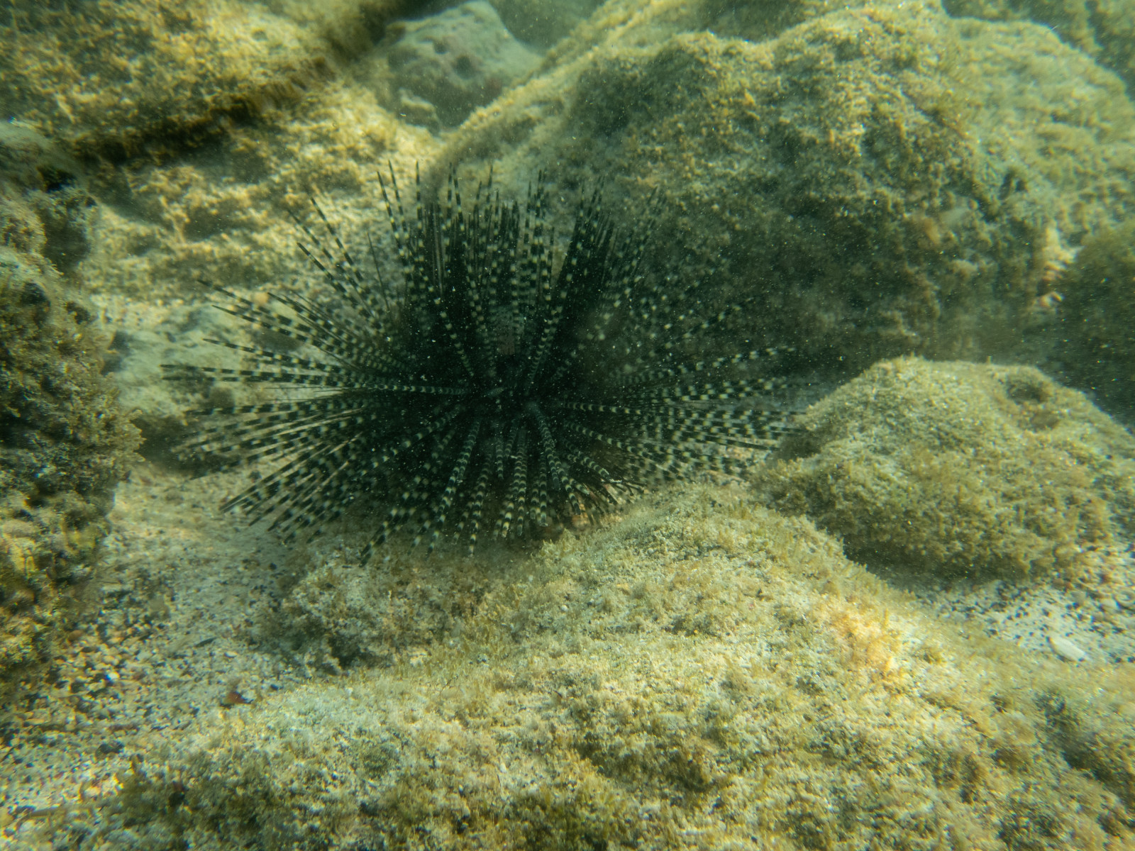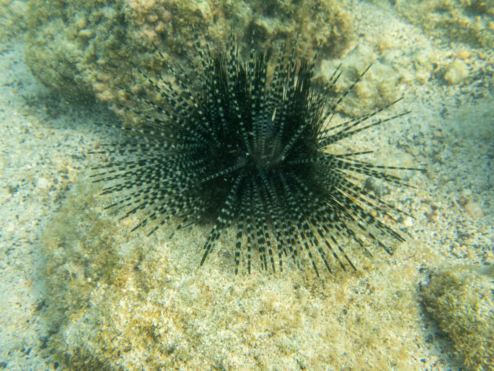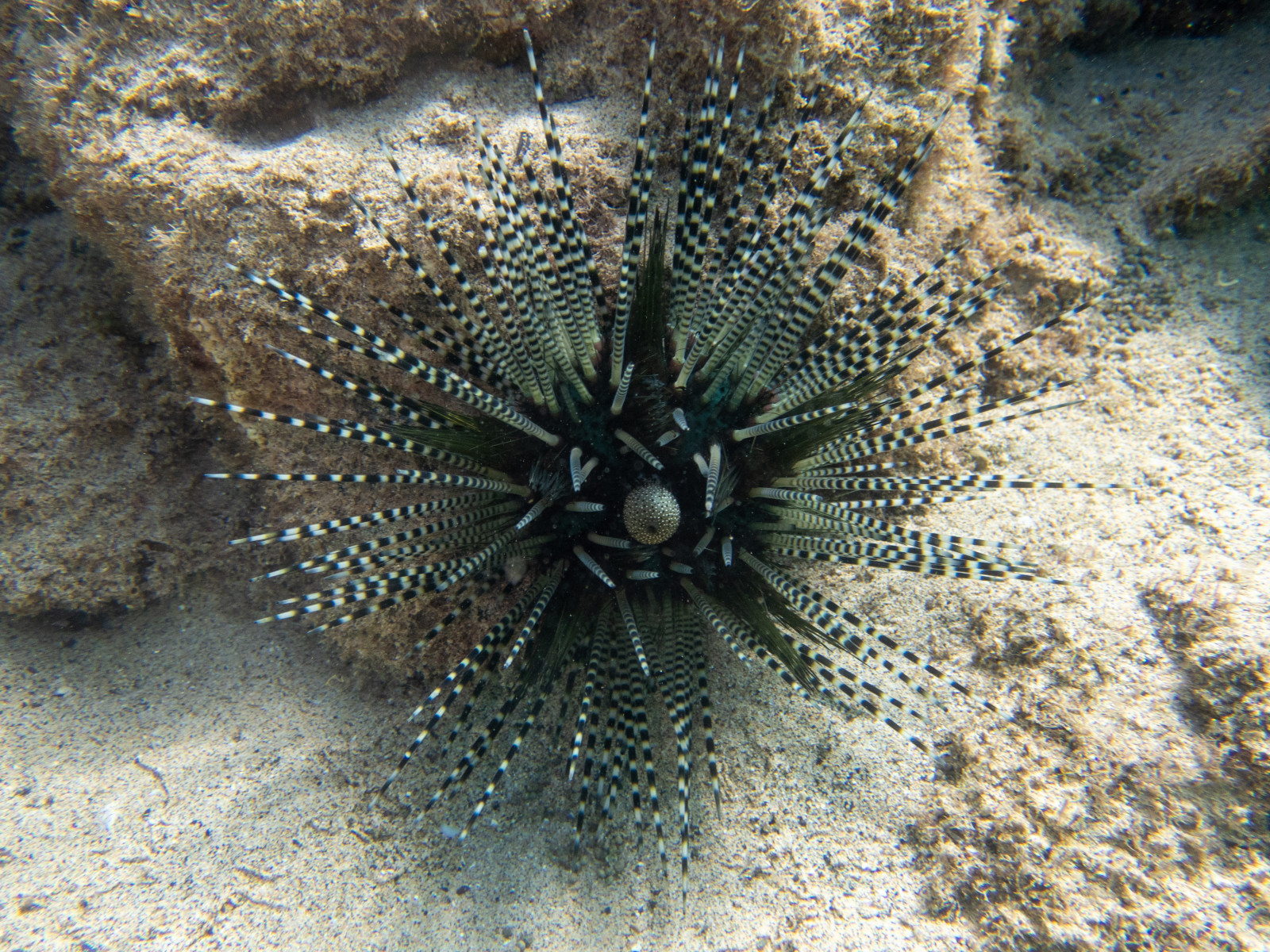Echinothrix calamaris, commonly known as the banded sea urchin or long-spined sea urchin, is a species of sea urchin belonging to the family Diadematidae. The genus name ‘Echinothrix‘ derives from the Greek ‘echinos‘ meaning ‘hedgehog‘ or ‘sea urchin‘, and ‘thrix‘ meaning ‘hair‘, referring to the long, thin spines of these urchins. This species is found in tropical waters of the Indian and Pacific Oceans, from the coasts of East Africa to the Pacific Islands, including the Philippines, Indonesia, Australia, and the Great Barrier Reef. It mainly inhabits coral reefs, lagoons, and rocky areas, from the intertidal zones down to depths of approximately 70 meters.