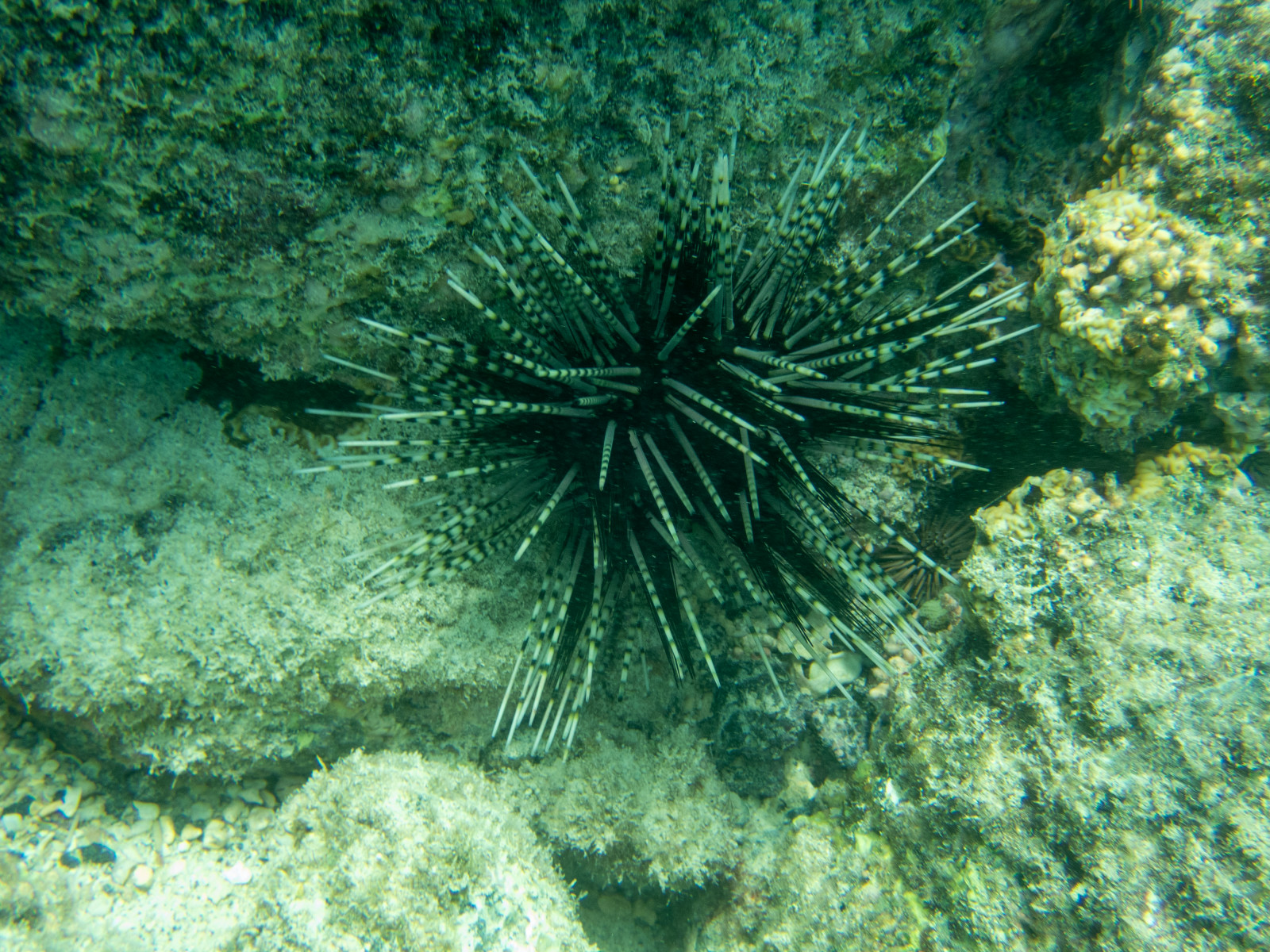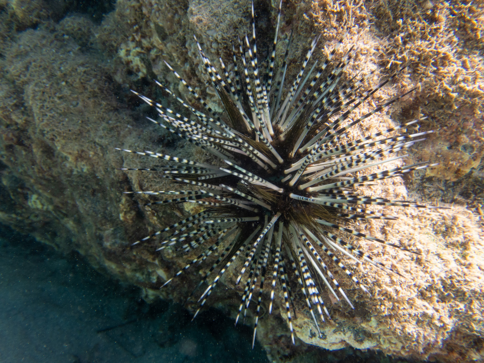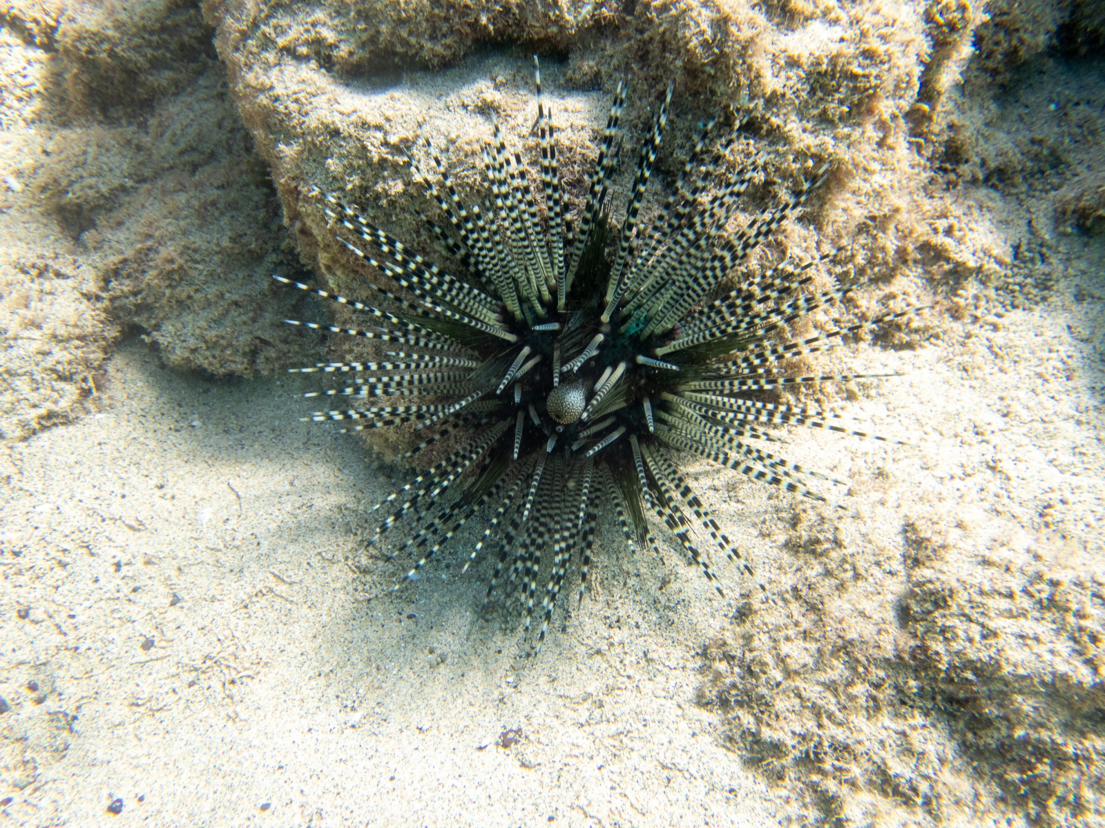 An interesting fact about Echinothrix calamaris is that, due to its long and sharp spines, it can cause painful injuries if handled without care. The spines are fragile and can easily break, becoming embedded in the skin. Although not venomous, the wounds caused by the spines can become infected, so direct contact with this urchin should be avoided. In addition, Echinothrix calamaris is considered an indicator species in coral reefs, as its abundance may reflect ecological imbalances, such as a decline in natural predators or algal overgrowth due to eutrophication.