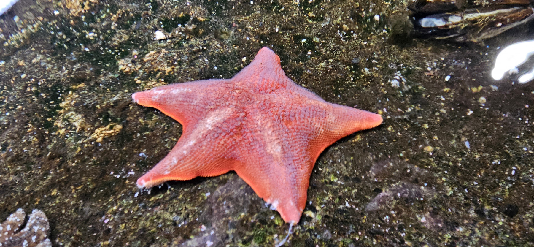 In addition to its key role as a seafloor cleaner, Patiria miniata is known for its unusual ‘fighting’ behavior, in which individuals gently push each other by overlapping their arms without causing apparent harm. It has commensal relationships with the polychaete Ophiodromus pugettensis, which lives in the ambulacral grooves on its oral surface, feeding on leftover food without harming the host. This species is also a common model organism in scientific studies on embryonic development and regeneration, and is bred at institutions such as the Marine Biological Laboratory (MBL). However, it is affected by the ‘sea star wasting syndrome’, a devastating disease linked to rising ocean temperatures, which can cause rapid and massive disintegration of the animal.