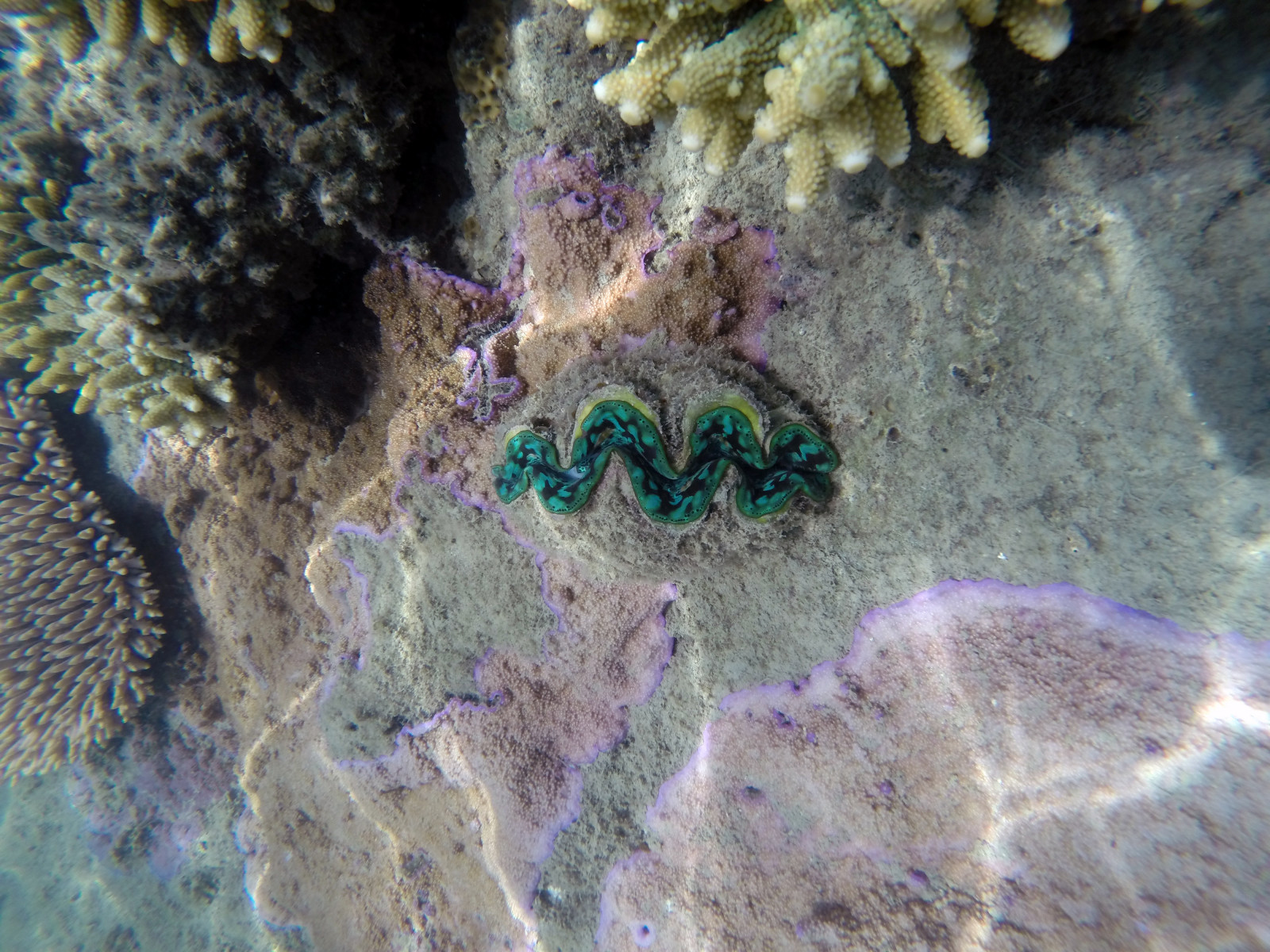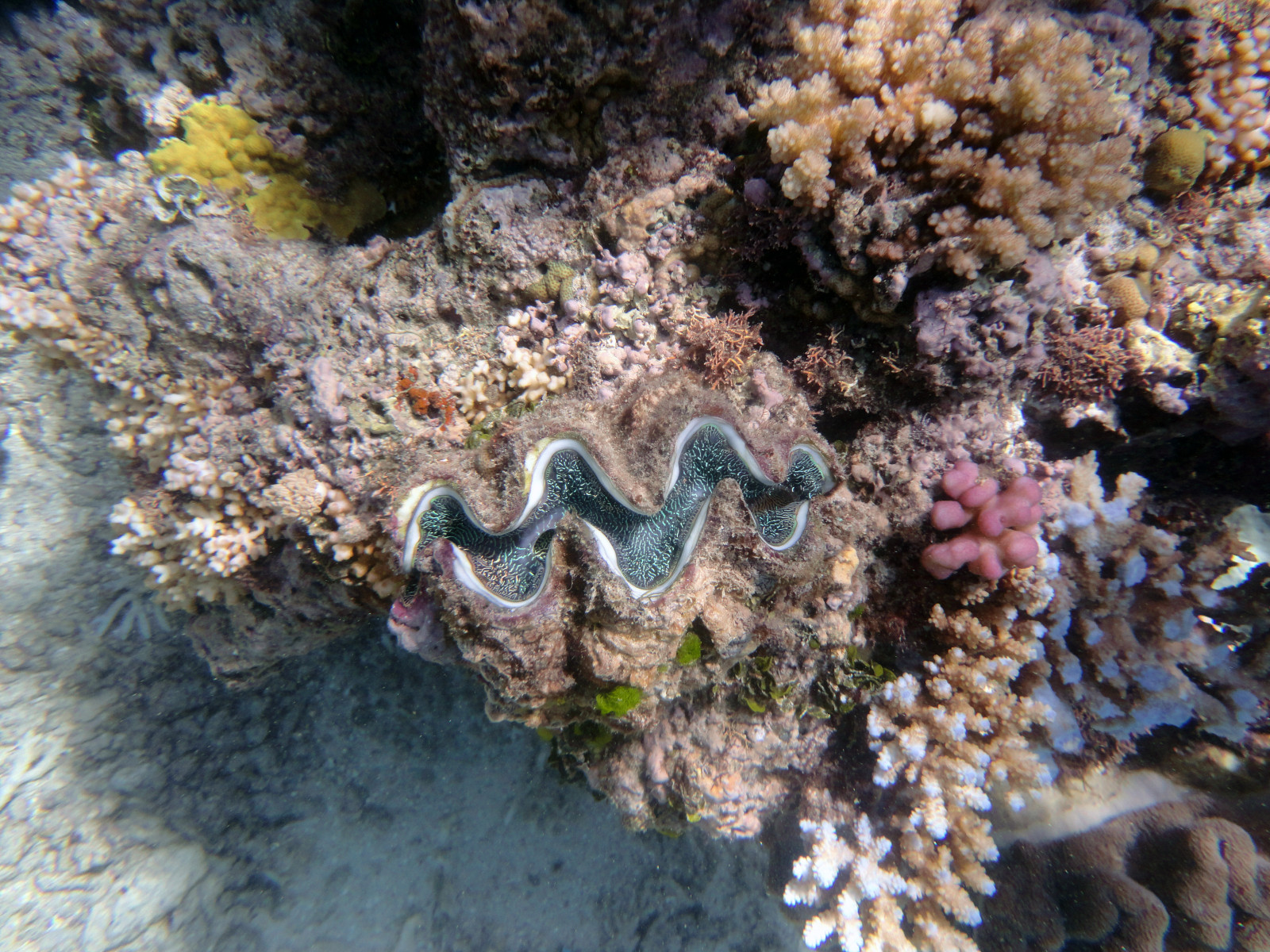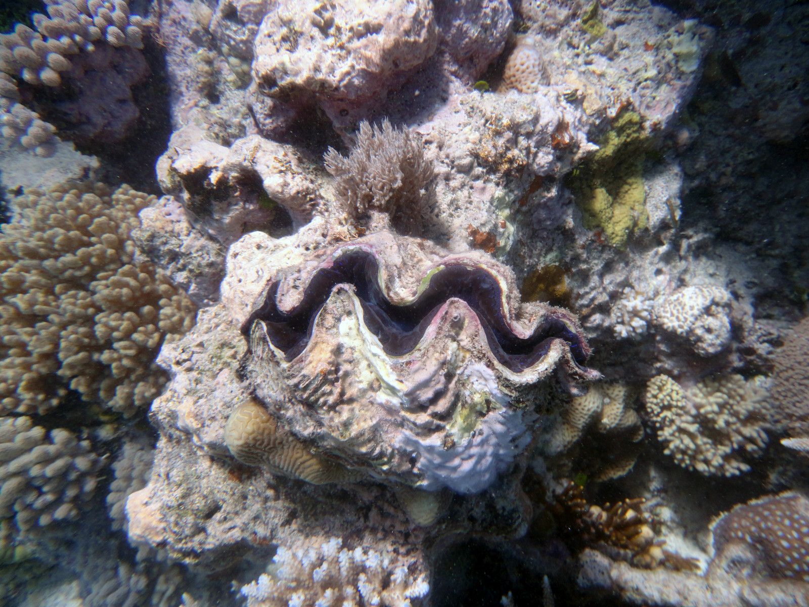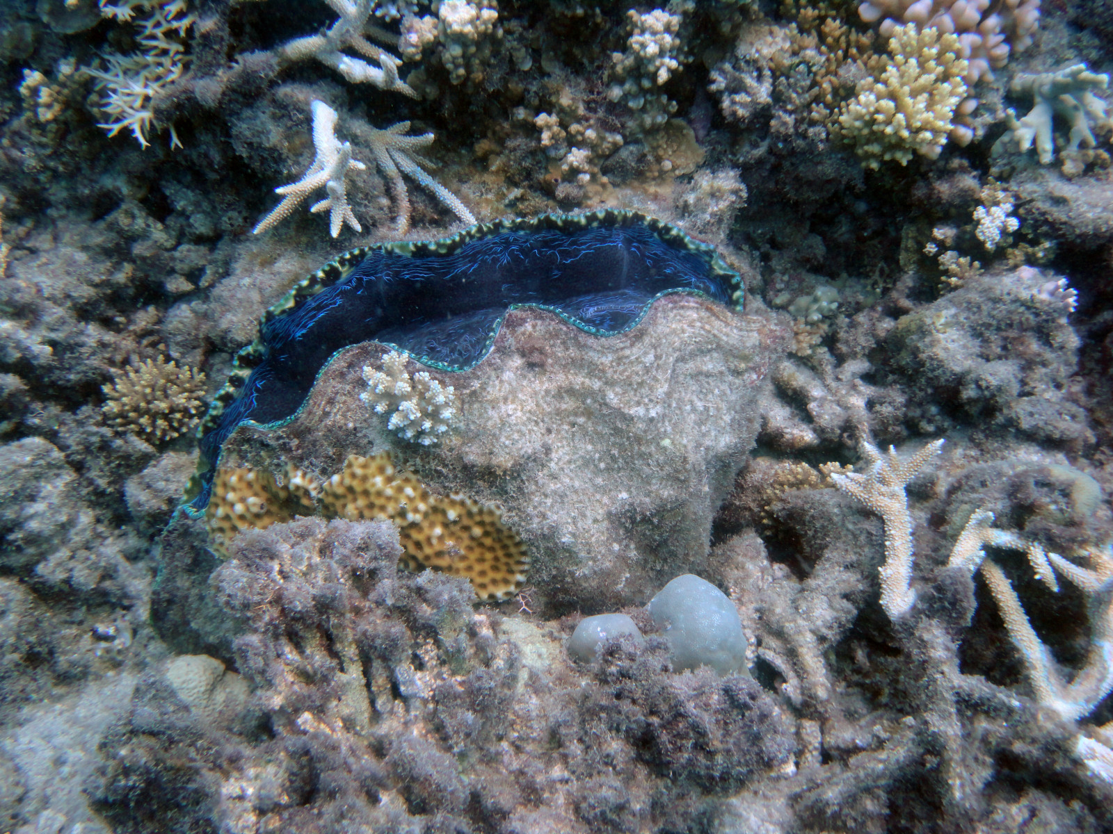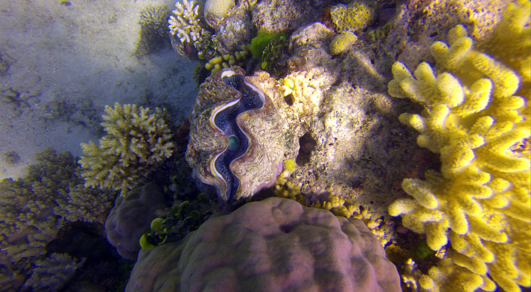 We can find the Tridacna on sandy bottoms and among the reef corals, usually in shallow, very sunny waters without large currents. Between 75 and 90% of their food needs are covered by the unicellular algae (zooxanthellae) that live in symbiosis in the mantle of these bivalves. The algae carries out the photosynthesis generating oxygen and sugars that are shared with the clam. The rest of their nutritional needs are covered by filtering the water around them, thus capturing plankton and organic matter dissolved in the water.