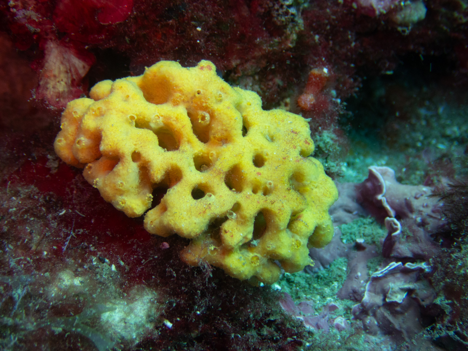 Axinella damicornis is a species of sponge belonging to the class Demospongiae, within the phylum Porifera. The genus name ‘Axinella‘ comes from the Greek ‘axine‘ meaning axe, referring to the shape of some structures of these sponges, while ‘damicornis‘ is derived from Latin and alludes to its ‘horn-like branching‘ form, as its appearance resembles branched coral or deer antlers. It is commonly known as the ‘horn sponge‘ due to this characteristic shape. Axinella damicornis is widely distributed in the Mediterranean Sea and the northeastern Atlantic Ocean, primarily inhabiting rocky areas and underwater walls between 10 and 50 meters deep. It prefers zones with moderate to strong currents that provide nutrients, allowing it to carry out its filter-feeding.