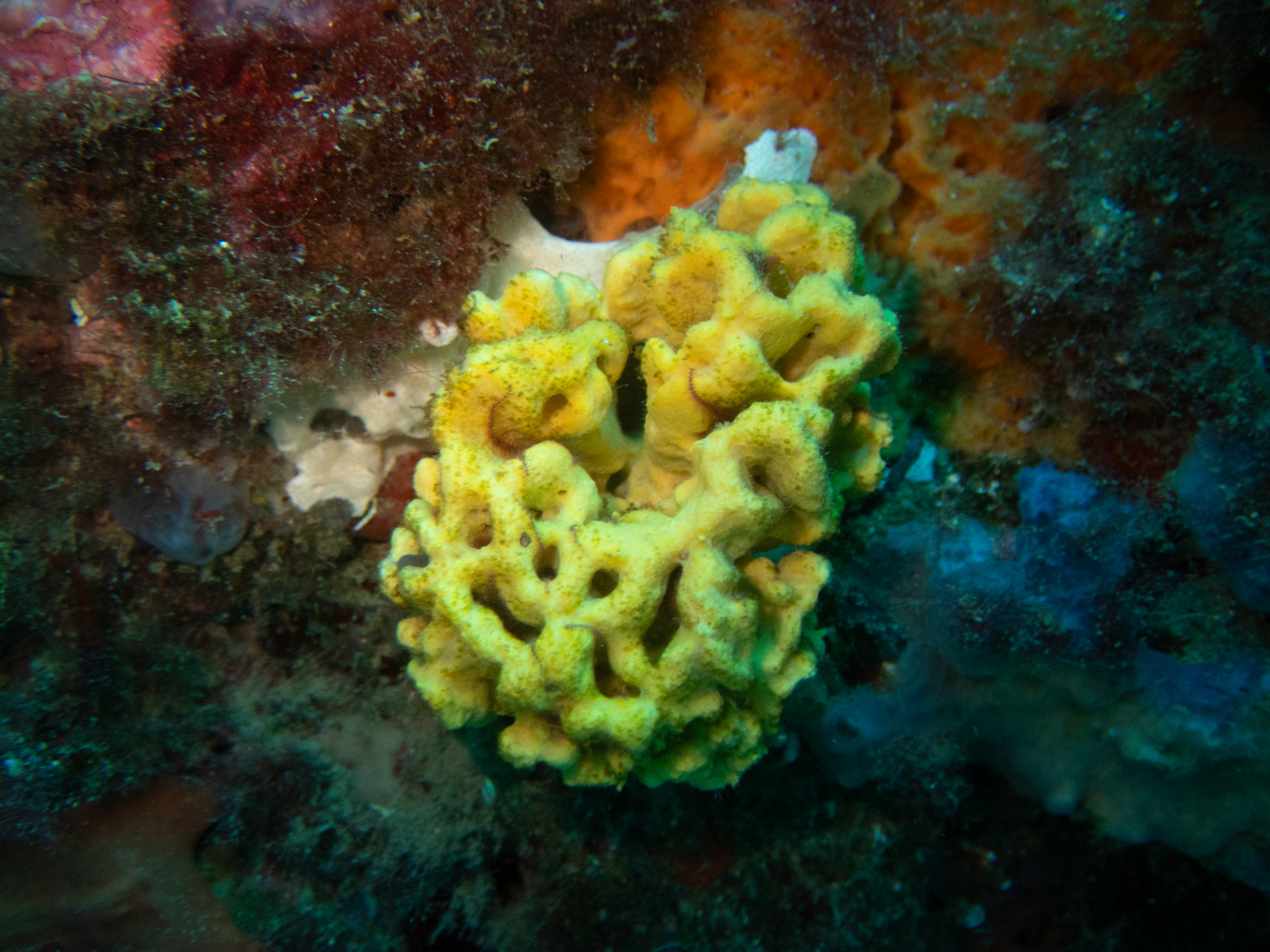 Axinella damicornis has a branched structure, with a body divided into several erect branches that can reach between 10 and 30 cm in height. These branches have a rough and sometimes spiny surface, and their color ranges from yellow-orange to brown. This bright coloration makes it easily recognizable in the rocky habitats where it resides. The sponge’s texture is relatively firm due to the presence of silica spicules that provide structural support. A distinctive feature that can help differentiate Axinella damicornis from other branched sponge species is the arrangement of its pores and oscula, which are irregularly distributed along the branches. This contrasts with similar species, such as Axinella polypoides, which usually show a more regular pattern in their surface structures.
