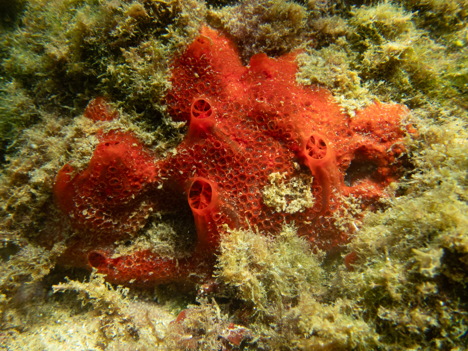 Phorbas fictitius (Bowerbank, 1866), commonly known as the red encrusting sponge, belongs to the family Hymedesmiidae within the order Poecilosclerida of the class Demospongiae. Its specific name ‘fictitius‘ comes from Latin, meaning ‘false‘ or ‘artificial‘, referring to the erroneous initial assignment to the genus Microciona, later corrected by Bowerbank. This species primarily inhabits rocky substrates in the infralittoral zone, in areas exposed to strong currents, where it attaches to vertical walls, beneath stones, and on shells. It is distributed throughout the northeastern Atlantic (Azores, Canary Islands, Madeira, and European coasts up to the North Sea) and the Mediterranean Sea, occurring in both the western and eastern basins. It is commonly found at depths of 20 to 60 meters in shaded areas with clear or moderately turbid waters.