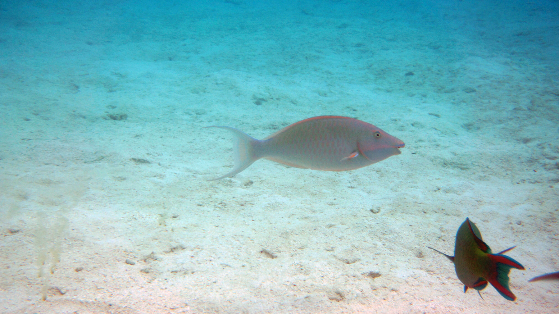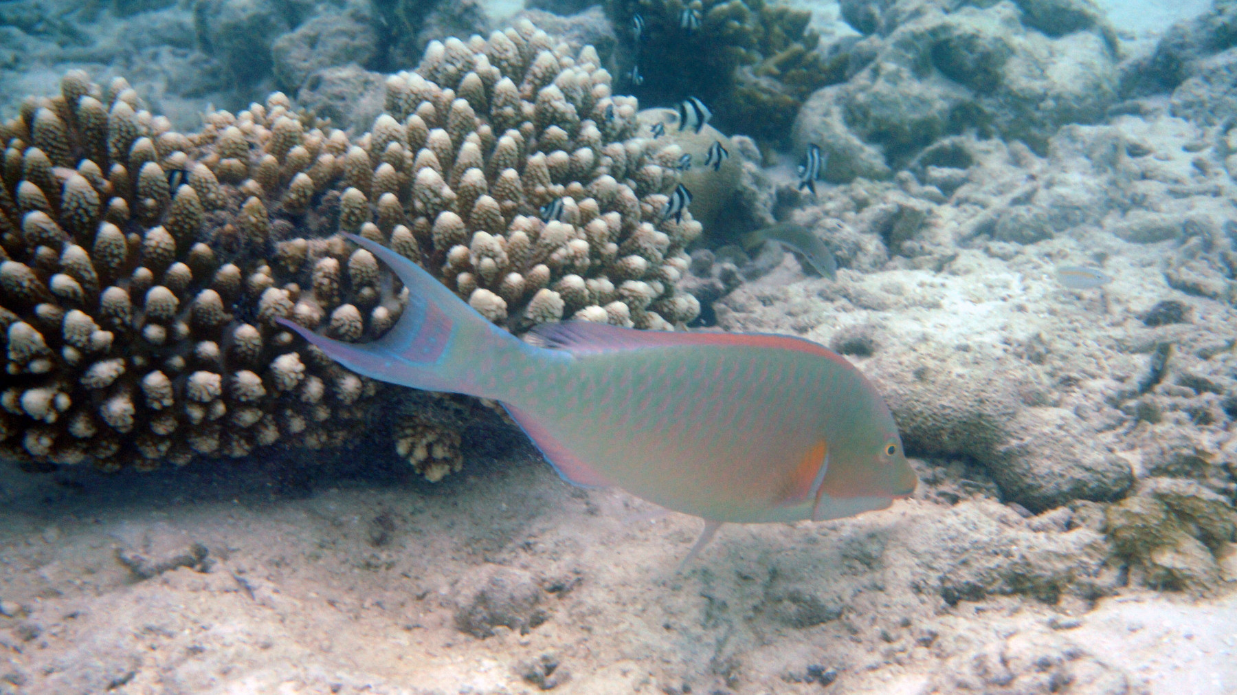 Hipposcarus harid forms harems composed of one terminal stage individual, or male, and numerous early stage individuals, or females. In the initial phase, this parrotfish is brownish-yellow on the back with a whitish underside. It has large scales with lighter colored edges. In the terminal phase, its green base becomes blue on the belly. The scales change color at their margins to become pink. A long pink line runs from the beak to the middle of the body, passing through the axis of the pectoral fin. The tail lobes taper into long filaments. Both males and females have orange-yellow eyes.