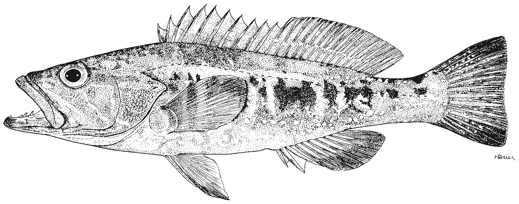 The Serranus atricauda has a robust, laterally compressed body that can reach up to 40 cm in length, though most individuals typically measure between 20 and 30 cm. Its general coloration is brown or grayish, with darker tones on the upper body and lighter tones on the belly. The most distinctive feature is its caudal fin, which is black or very dark, giving the species its specific name. It often displays dark vertical bands along its body, which become more evident when the fish is stressed or defensive. This coloration pattern helps it camouflage in rocky environments and blend with its habitat. It differs from other species of the genus Serranus, such as Serranus cabrilla, by the absence of reddish lateral lines and the darker caudal fin.