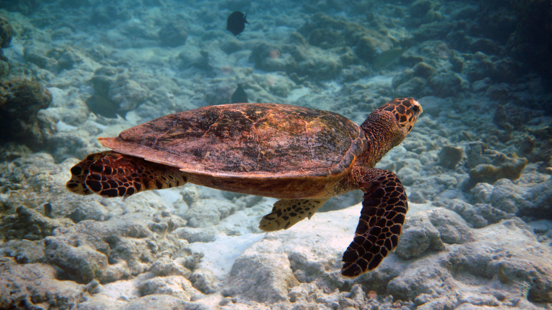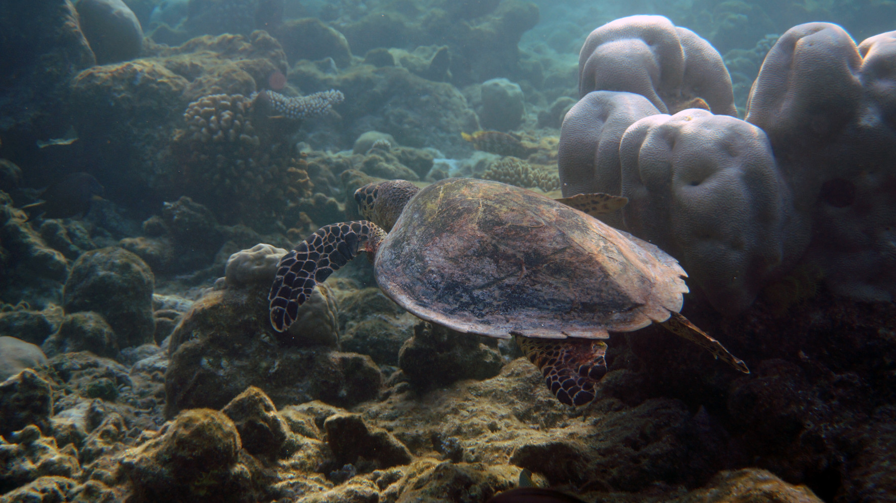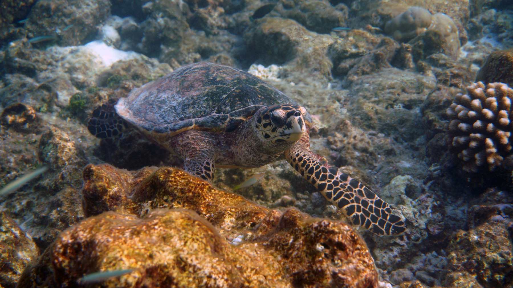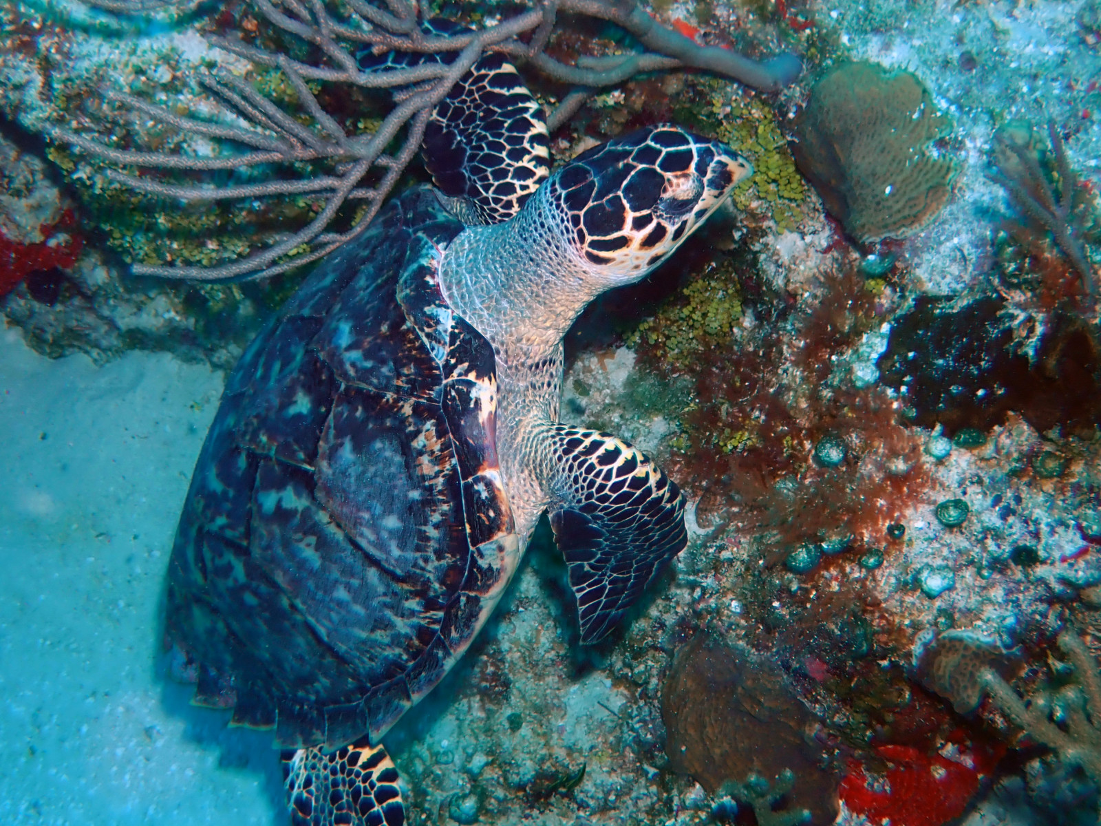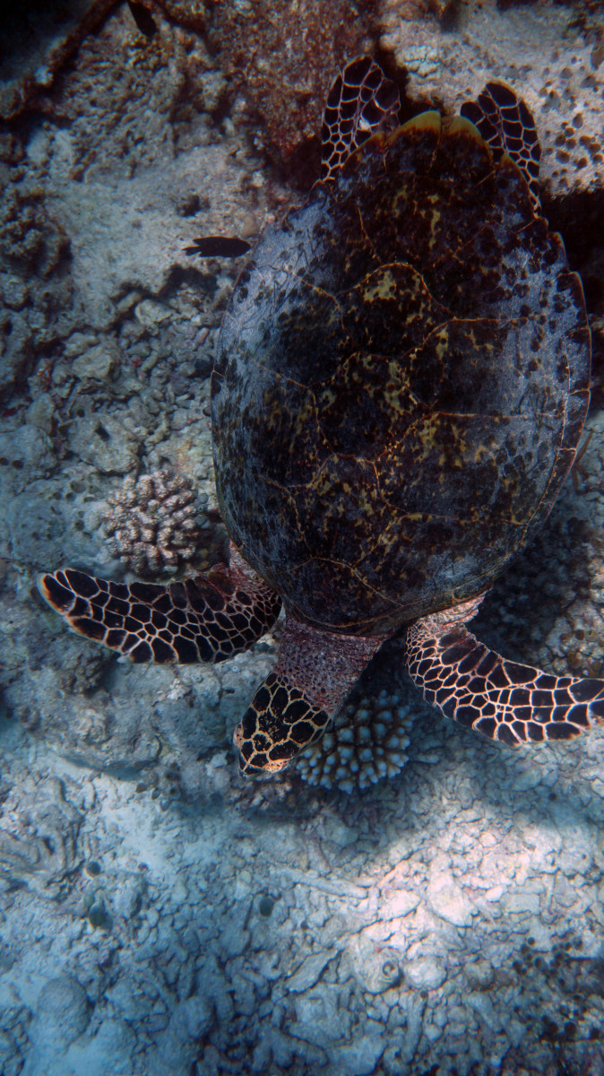 Within the order Testudines and the family Cheloniidae we find the hawksbill turtle or Eretmochelys imbricata. It is a sea turtle that inhabits the waters of the central Atlantic and Indo-Pacific oceans. It is often associated with areas of coral reefs or shallow water seagrasses and usually coastal.