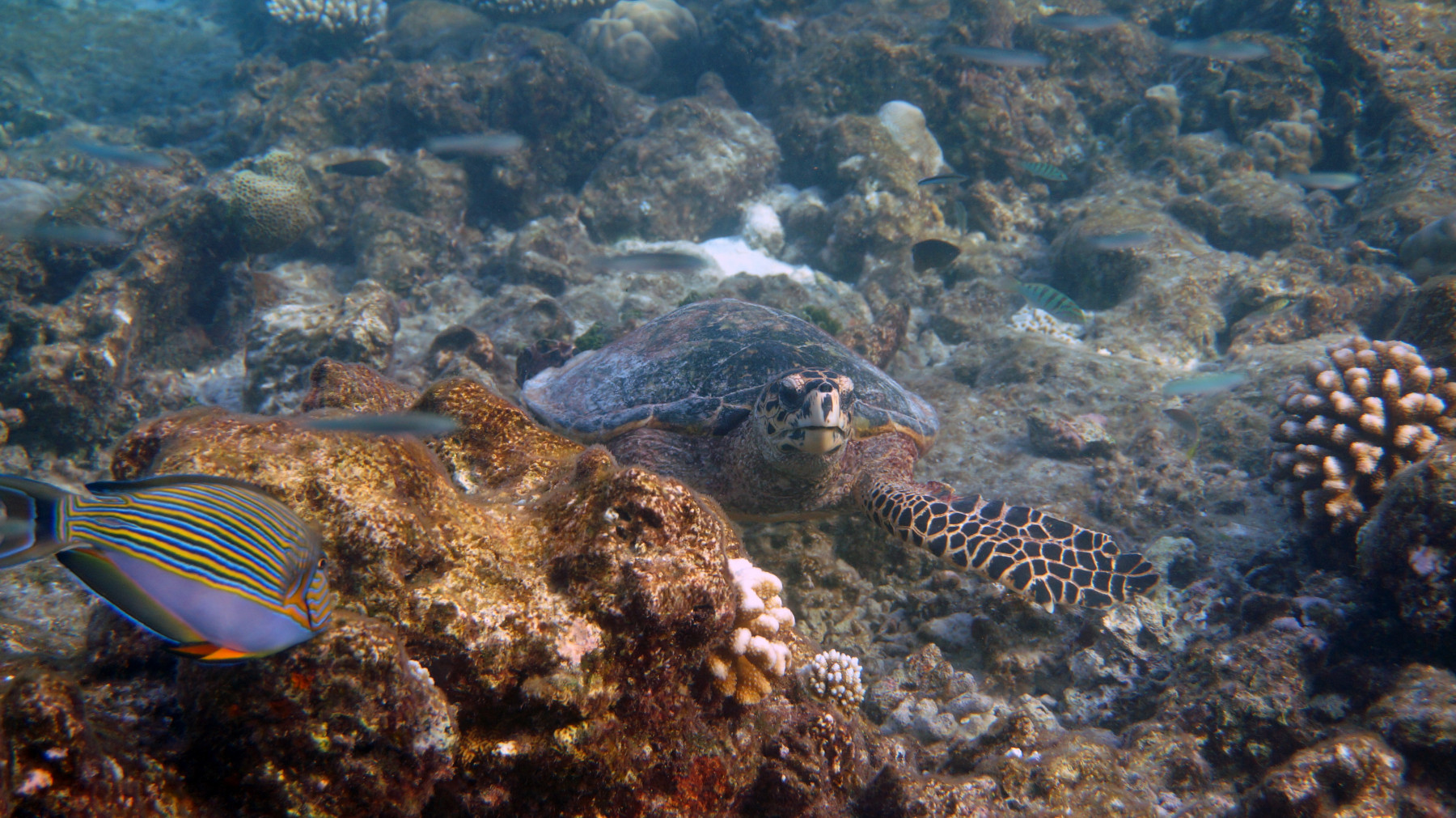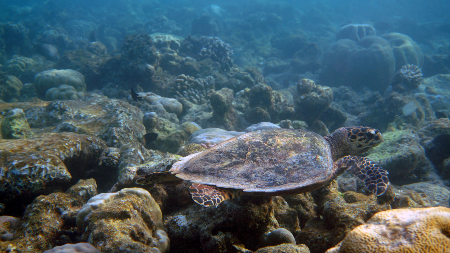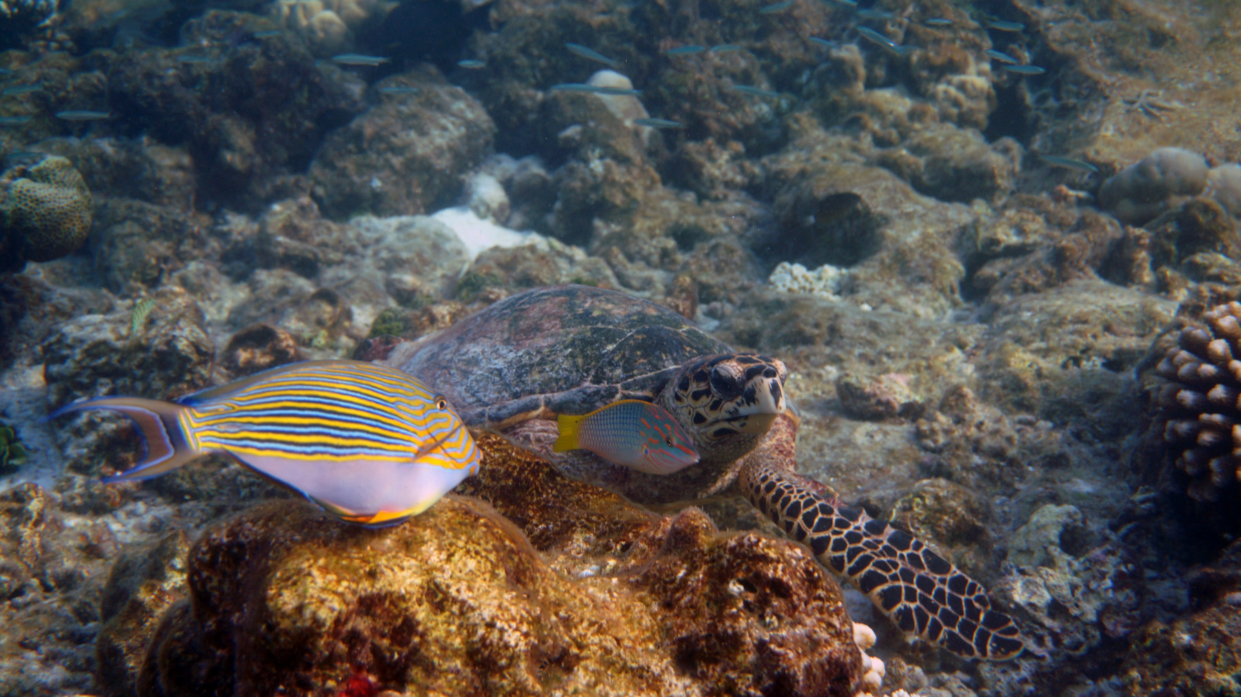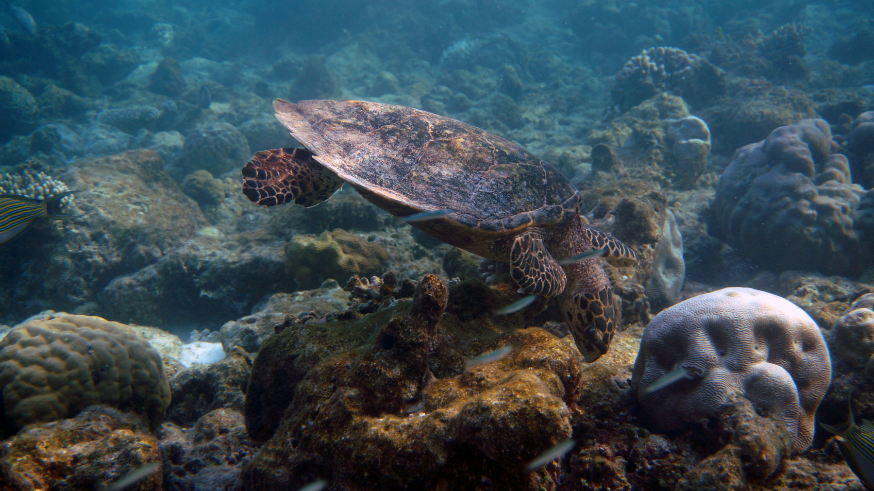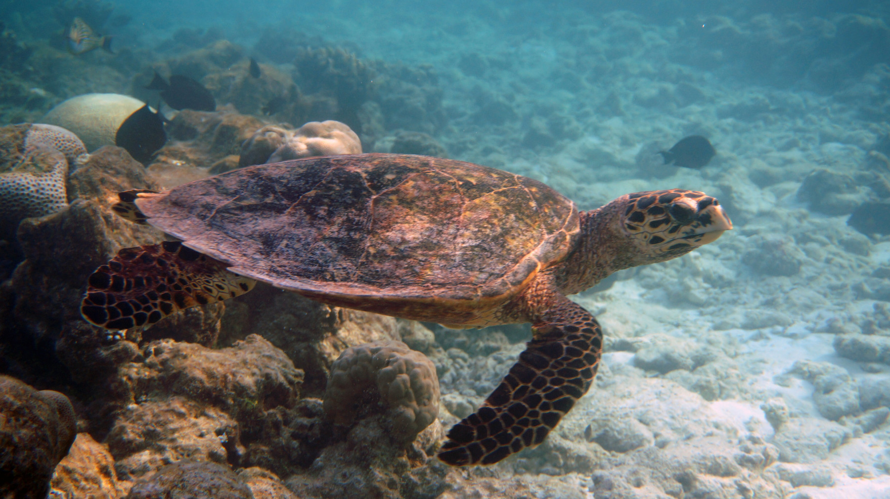 Within the order Testudines and the family Cheloniidae we find the hawksbill turtle or Eretmochelys imbricata. It is a sea turtle that inhabits the waters of the central Atlantic and Indo-Pacific oceans. It is often associated with areas of coral reefs or shallow water seagrasses and usually coastal.