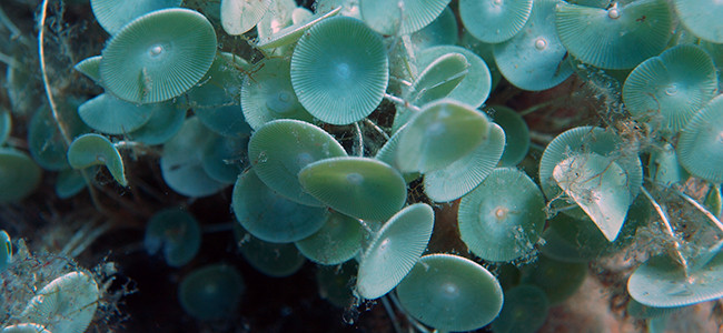 La Acetabularia acetabulum es un alga verde pálido con forma de sombrilla y endémica del Mediterráneo. Se caracteriza por estar altamente calcificada, echo que determina el tono blanquecino de los ejemplares. Forman extensas colonias, cuyos individuos se fijan al sustrato por medio de pequeños rizoides. Cada individuo puede llegar a alcanzar los 8 cm de altura, y está formado por una única célula, cuyo núcleo está situado en la parte inferior cercana a los rizoides. Habita zonas rocosas en aguas tranquilas del Mediterráneo occidental y Adriático norte. La Acetabularia acetabulum se reproduce durante los meses de mayo a junio, época en la que se pueden apreciar totalmente formadas las sombrillas segmentadas, formada por multitud de gametangios unidos entre si. El núcleo de la célula, presente en la zona de los rizoides, se divide en unos 15.000 – 20.000 núcleos menores que emigran a las cámaras de la sombrilla, desde allí son liberados al interior de unas esporas flageladas. Estas esporas abandonan la sombrilla, quedando de forma libre en la columna de agua, donde se mueven libremente gracias a los flagelos. Durante este periodo de vida libre, las esporas de Acetabularia acetabulum requieren de un periodo de entre 12 y 15 semanas de reposo. Posteriormente pueden fusionarse entre sí dos esporas, perdiendo de esta forma la capacidad móvil, alcanzando el fondo marino, donde se desarrollará el ejemplar.
