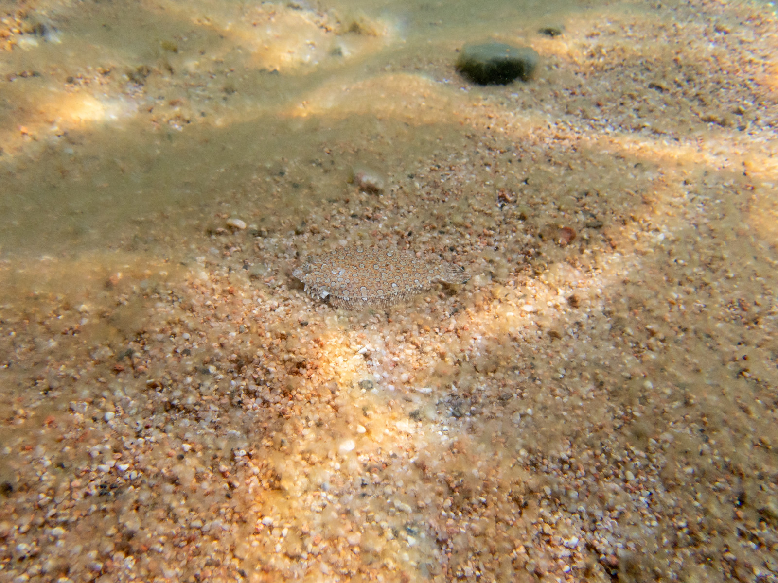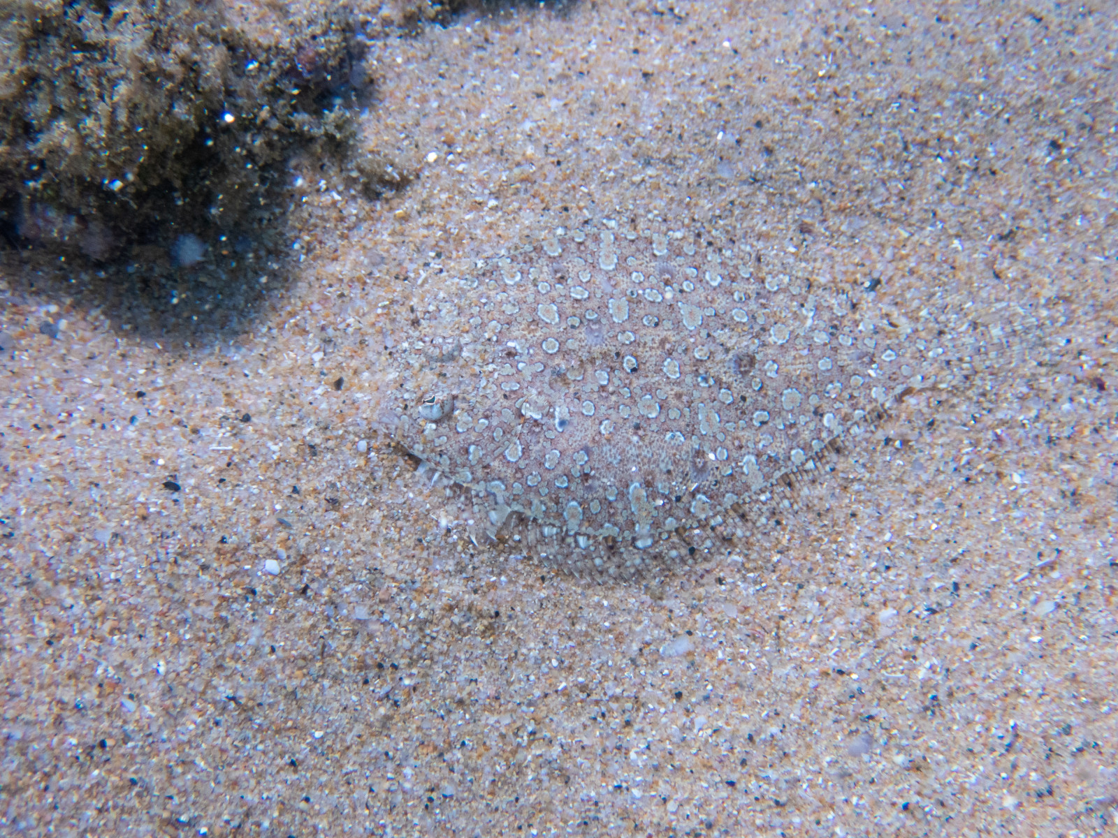 Bothus podas es un pez curioso, que, en ocasiones si nos movemos con sigilo, se nos acercará. Su coloración es extremadamente variable, entre el gris, pardo oscuro o el mismo color de la arena. Casi siempre suelen presentar manchas y puntos claros, y en ocasiones entre una y dos machas oscuras situadas en la parte posterior de la línea lateral.